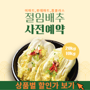 요즘 김장철은 다가오는데 배추 값이 많이 올라 걱정하시는 분들 많으시죠? 배추값 폭등에 김장비용 아낄 수 있도록 대형마트에서 절임배추 사전예약을 진행합니다. 마트별 예약기간과 할인금액이 다르니 할인받고 인증된 품질의 절임배추 구매하실 분들 이라면 이글 보시고 사전예약 놓치지 마세요!
