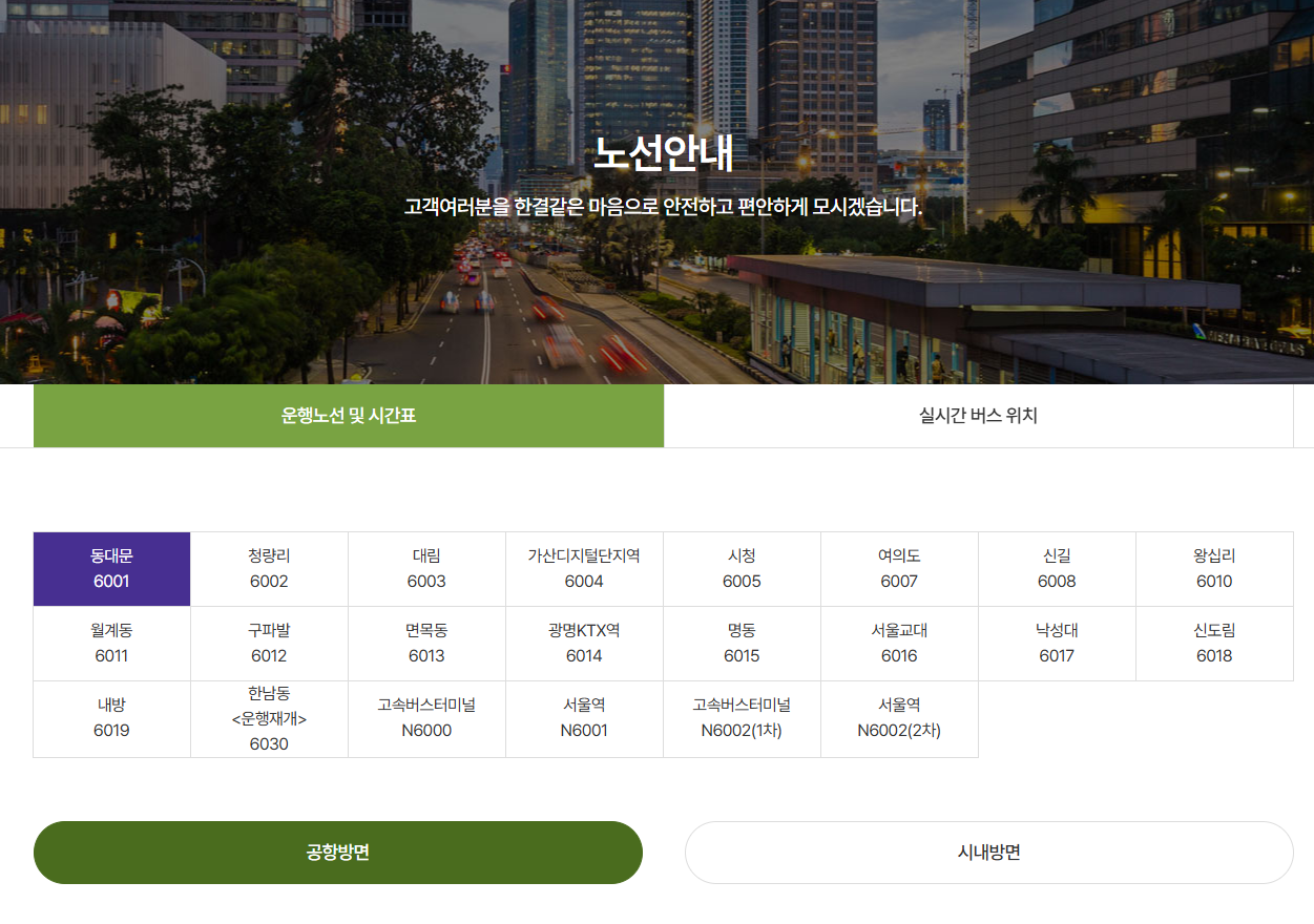 가장 정확한 버스 시간표는 공항리무진 공식 홈페이지에서 확인할 수 있습니다. 지역에 따라 배차 간격이 다르므로 출발하려는 시간과 노선을 기준으로 조회하세요.